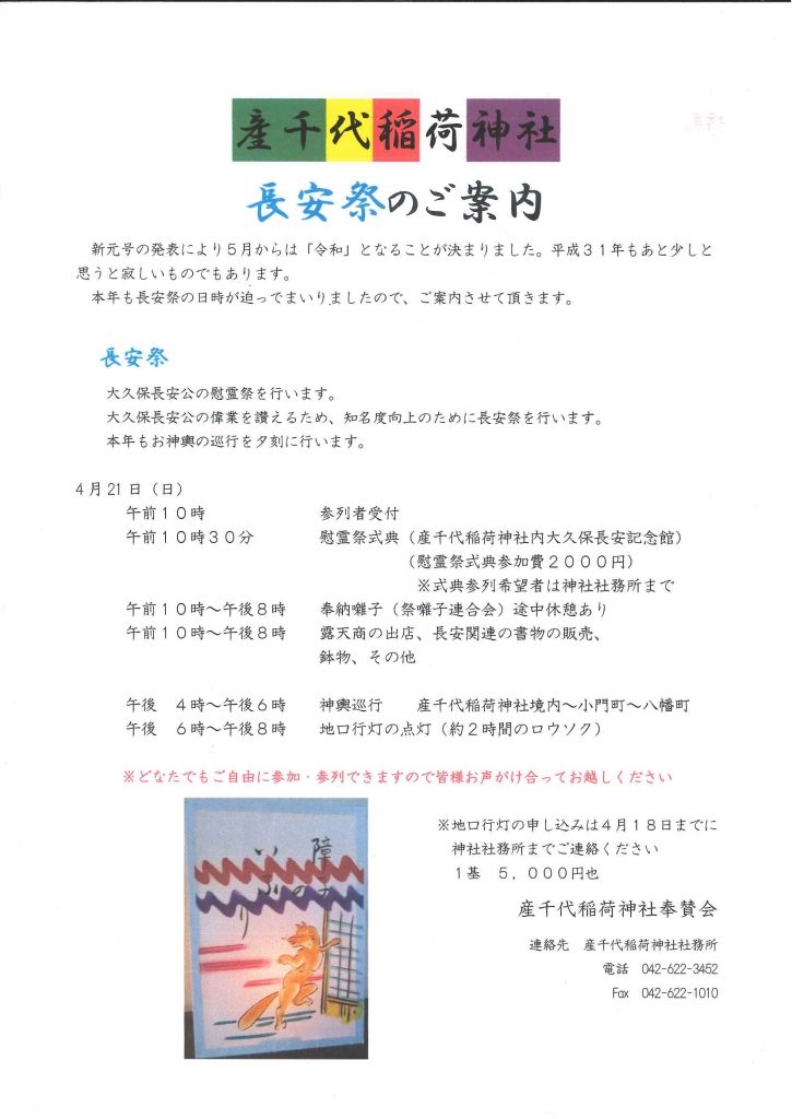 2019/04/19 4月21日(日)に産千代稲荷神社にて「長安祭」が開催されます。 大久保長安の慰霊祭と奉納お囃子が挙行され、露店や関連グッズの販売があります。 お神輿も巡行します。 ぜひお立ち寄りください!