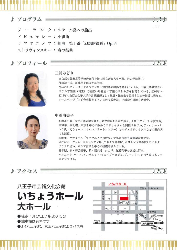 5月6日(月・祝)に「三浦みどり&中添由美子 ピアノデュオリサイタル」が開催されます。