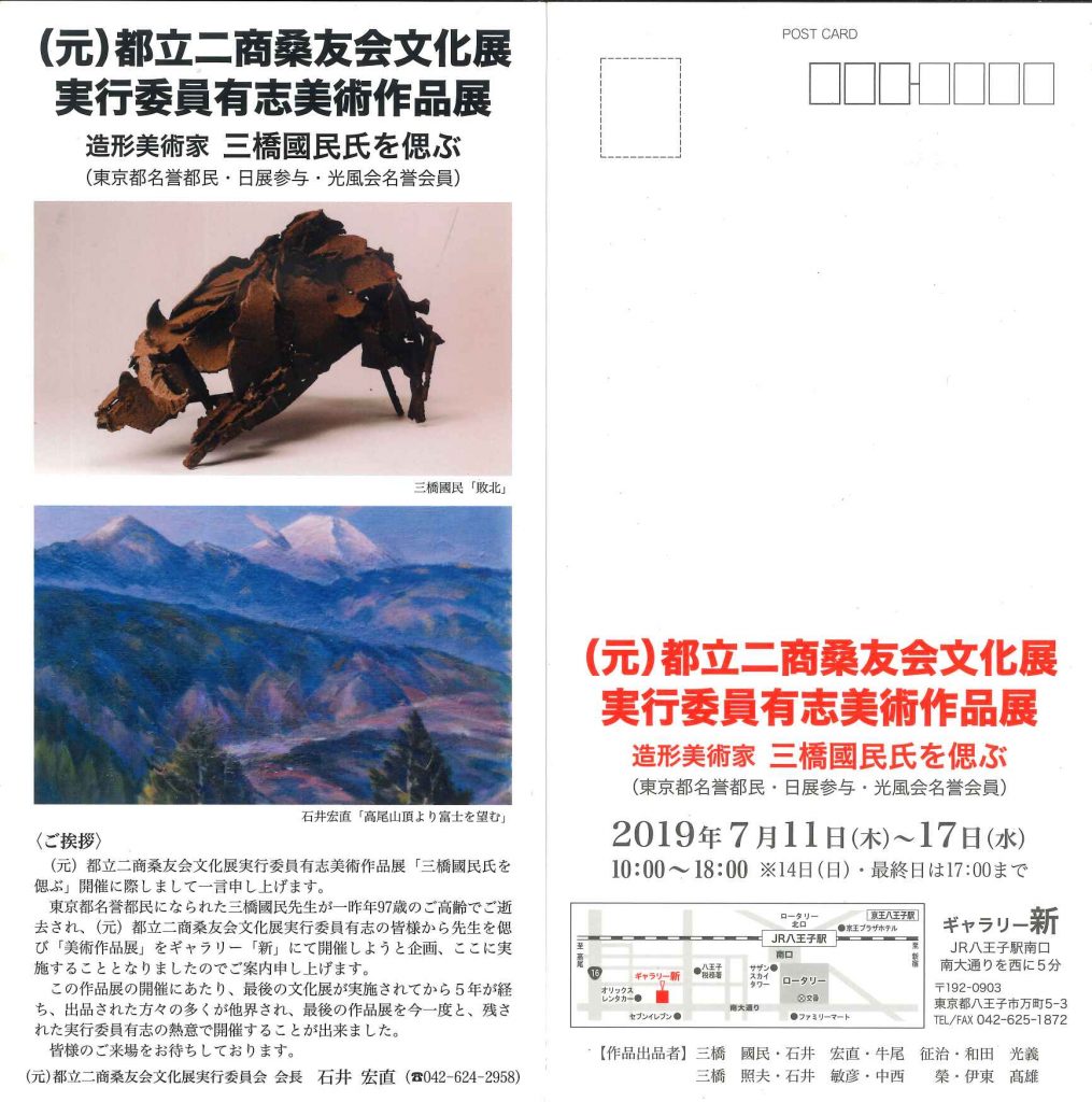 2019/07/08 7月11日~17日10時~18時(14日と17日は17時)、 八王子駅南口のギャラリー新にて、 「(元)都立二商桑友会文化展実行委員有志美術作品展」が開催されます。 造形美術家三橋國民氏を偲ぶ企画展もあります。 ぜひどうぞ! http://www.rg-shin.com/