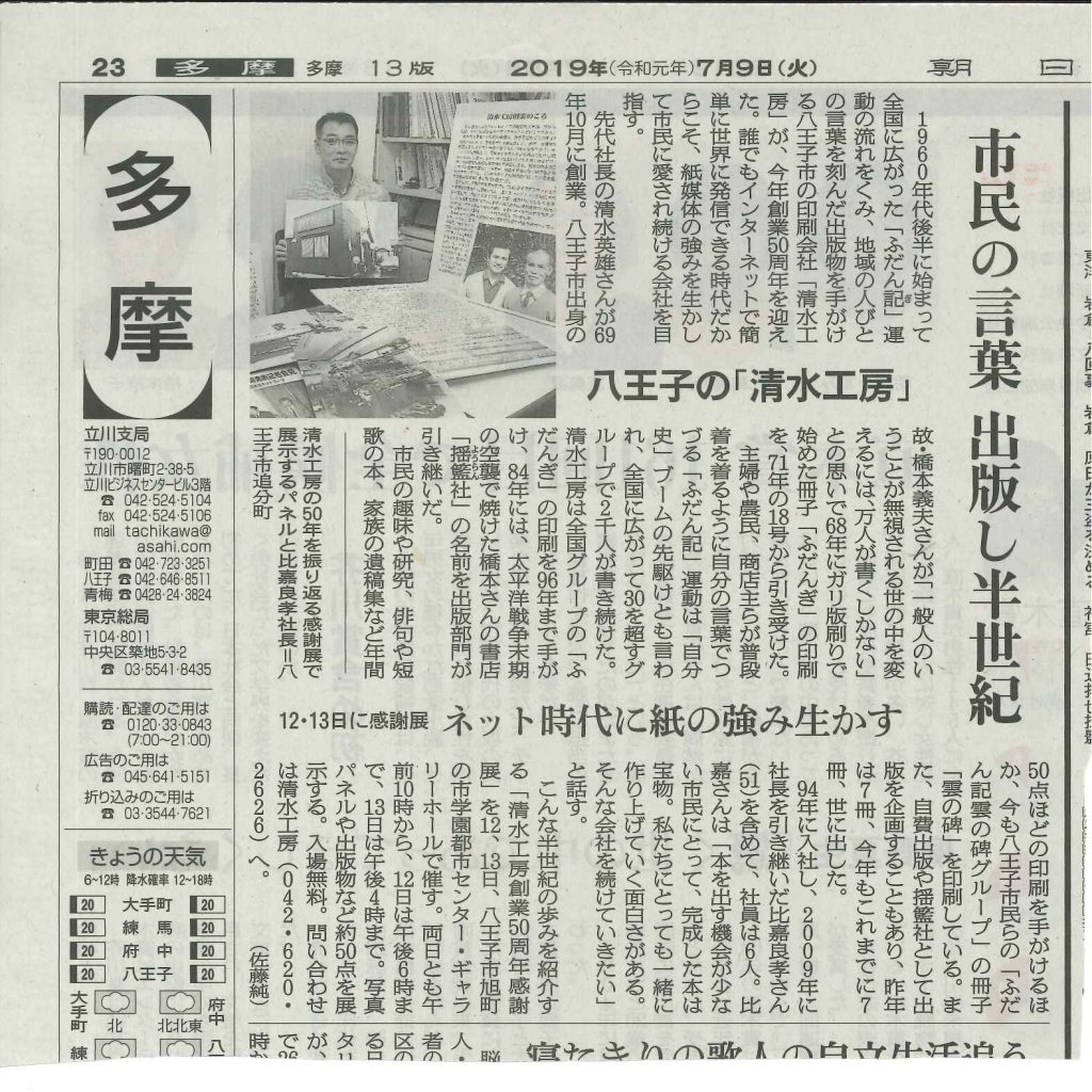 「清水工房創業50周年感謝展」の記事が、朝日新聞の多摩面に掲載されました。