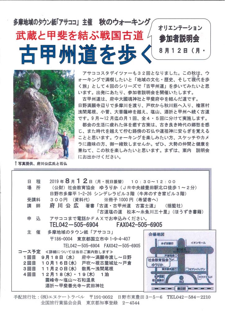 2019/08/05 タウン誌「アサココ」主催のウォーキングのお知らせ。 8月12日10時半~12時「武蔵と甲斐を結ぶ戦国古道 古甲州道を歩く」。 講師は『古道・古甲州道 古富士道』(揺籃社刊)の府川公広さん。 問合せ=042-505-6904 fumoto.info/k/