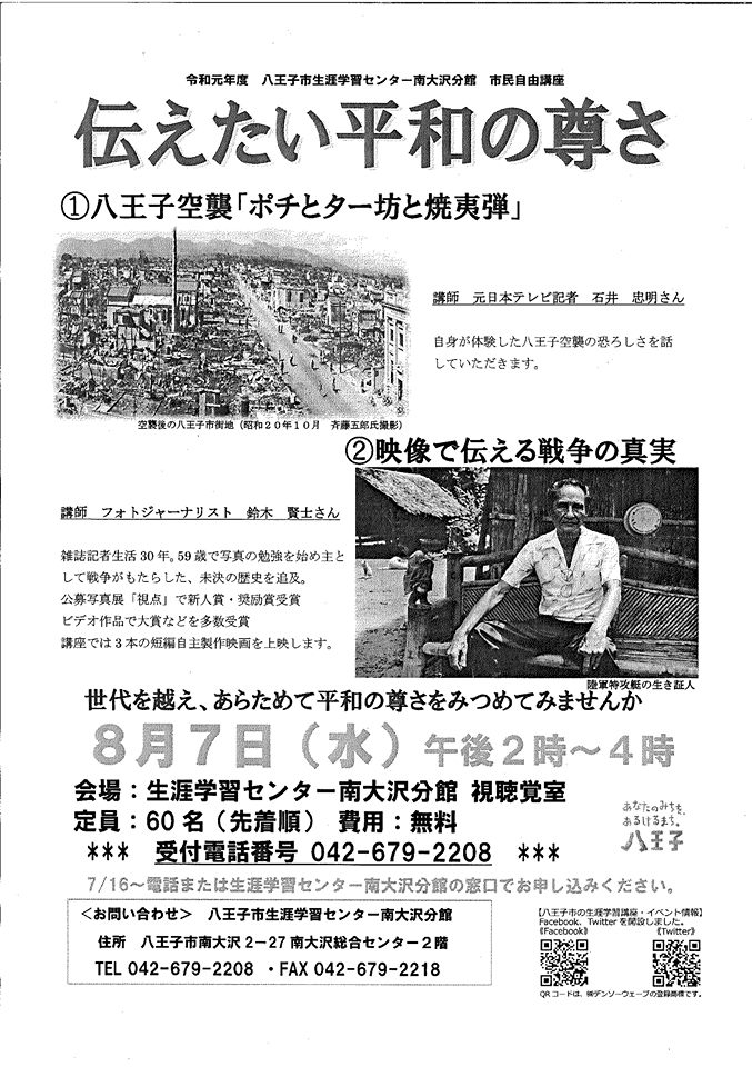 八王子空襲の体験談を赤裸々に語ります。猛暑ではありますが、お近くの方はぜひどうぞ。