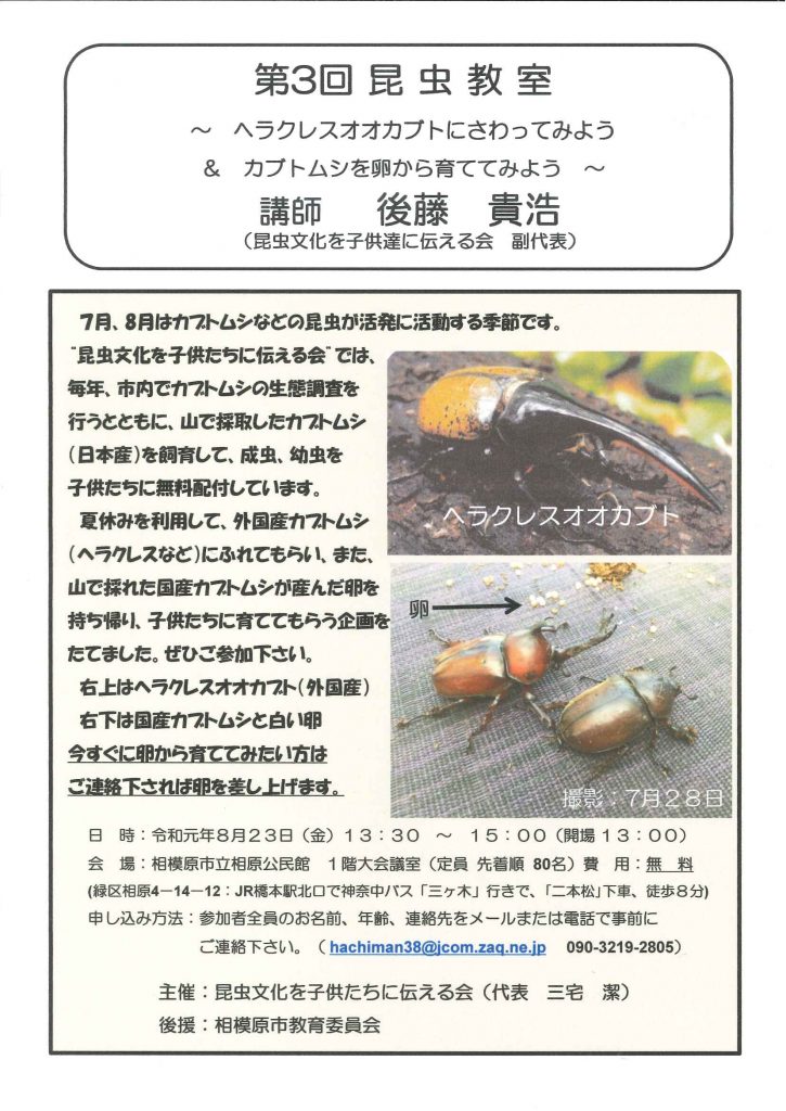 「昆虫文化を子供たちに伝える会」が「第3回昆虫教室」を開催します。