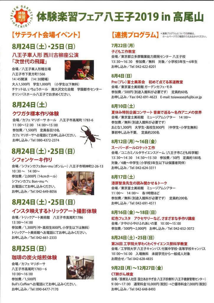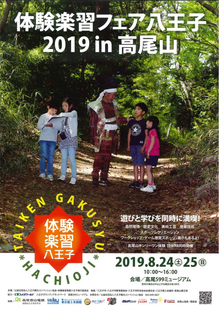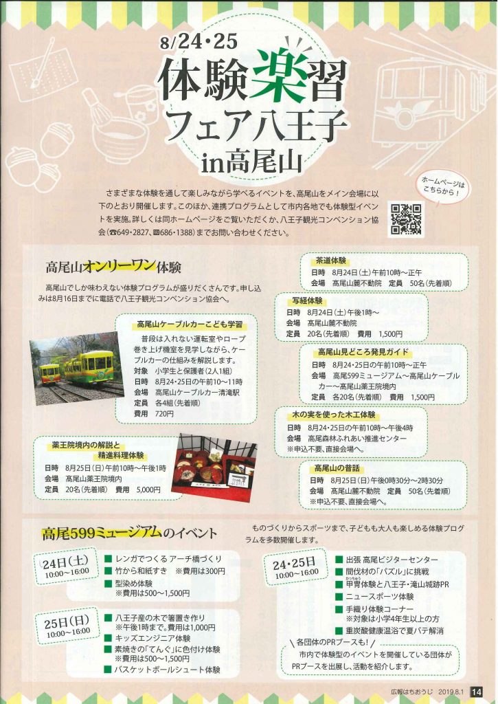2019/08/23 「体験楽習フェア八王子2019in高尾山」が24日25日に高尾599ミュージアムにて開催されます。 遊びと学びを同時に満喫できるイベントが盛りだくさん。 事前申し込みは不要。 この週末は高尾山へ。 http://taiken-gakushu-8.org/