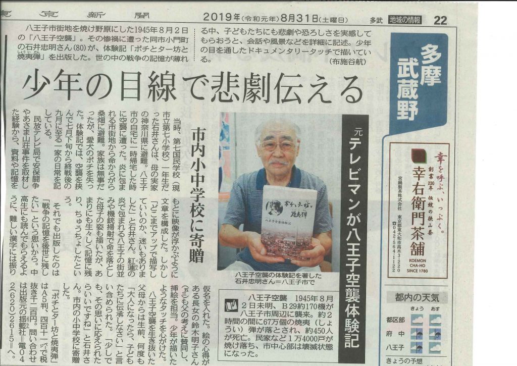 2019/09/02 石井忠明さん著『ポチとター坊と焼夷弾』(A5判、412P+口絵8P、1200円+税)が、 東京新聞にて紹介されました。 お蔭さまで問い合わせの電話がたくさんかかってきています。 市内書店、アマゾンで販売中!