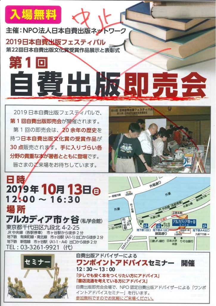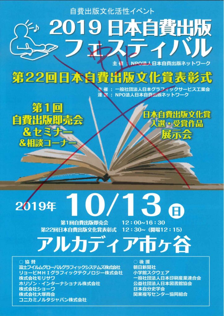 13日に予定されていた「2019日本自費出版フェスティバル」&「第1回自費出版即売会」は台風19号の影響で中止となりました。ご参加予定の方はご注意ください。