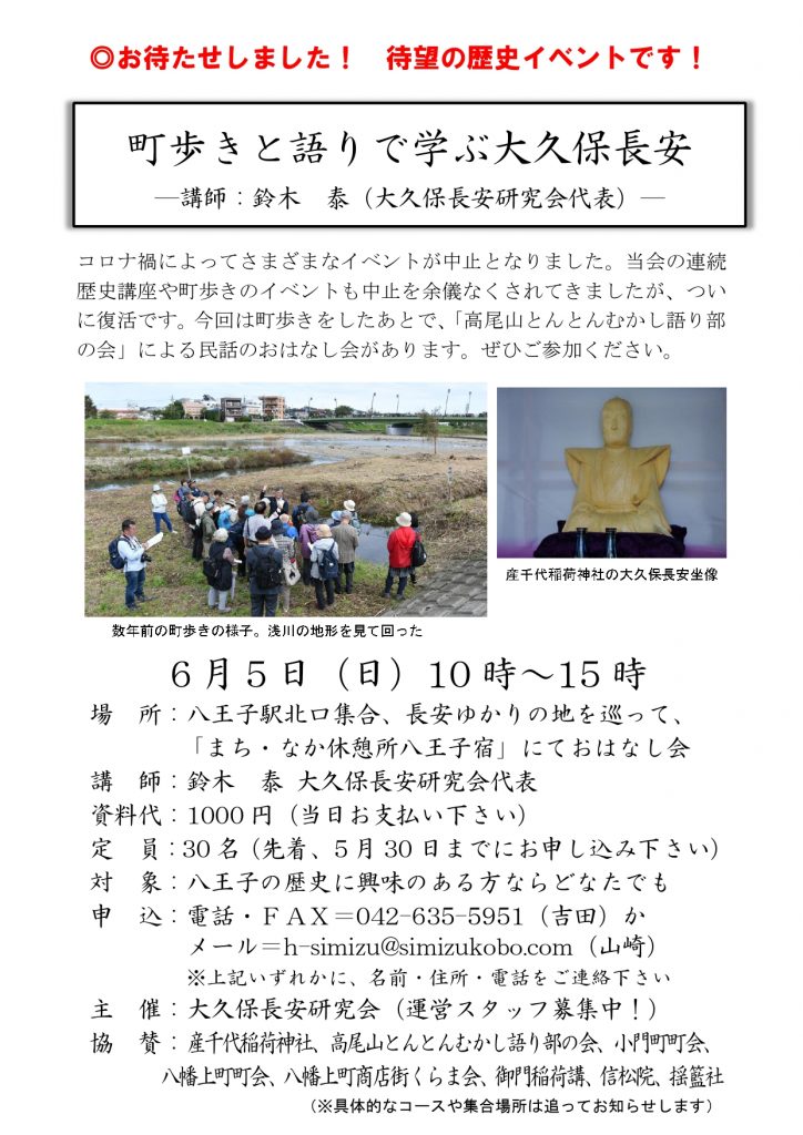 今回は大久保長安関連の史跡を巡る町歩きをしたあとで、「高尾山とんとんむかし語り部の会」による民話のおはなし会があります。