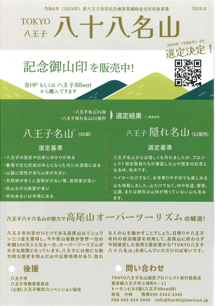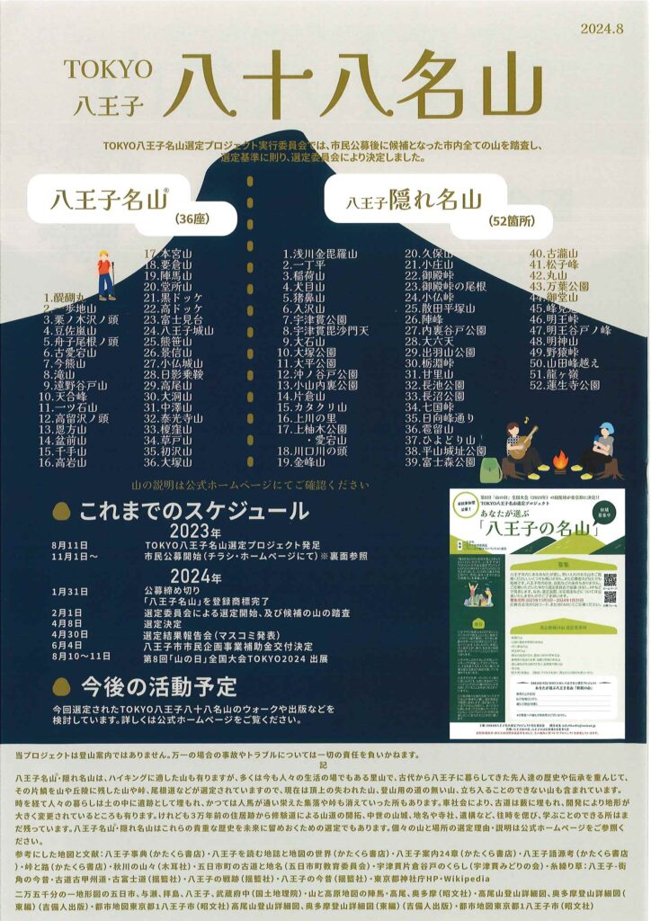 2024/09/04 【TOKYO八王子 八十八名山】 TOKYO八王子名山選定プロジェクト実行委員会により、八十八名山が決定しました。 ・八王子名山 36座 ・八王子隠れ名山 52箇所 詳しくはこちらまで↓ https://hachiojimeizan.jp/