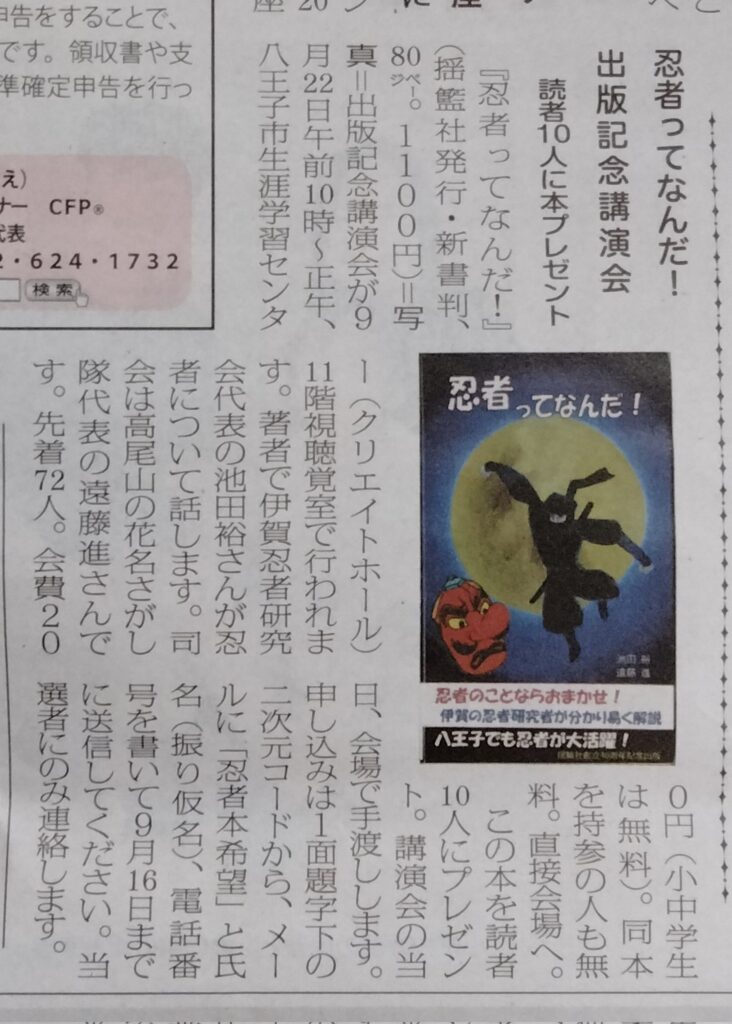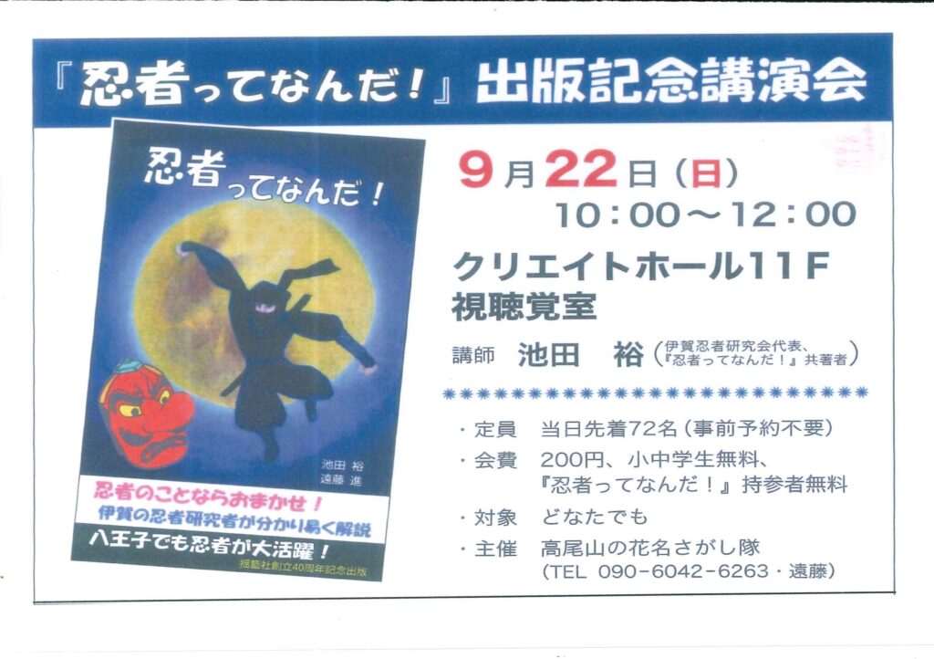 2024/09/12 【新刊『忍者ってなんだ!』の出版記念講演会】 忍者のイロハが学べますよ! ・9月22日(日)10時~12時 ・八王子市生涯学習センター11F 視聴覚室 ・72名(事前予約不要) ・200円(資料代) 小中学生無料、本書持参者無料 ・高尾さんの花名さがし隊主催 ※ショッパーにも掲載されました