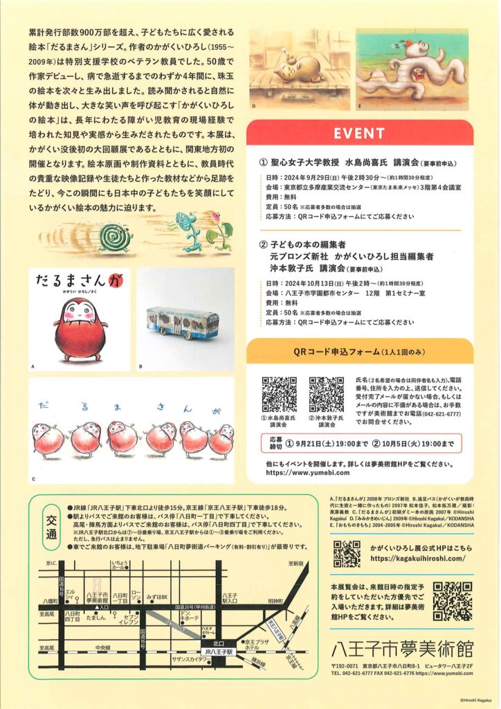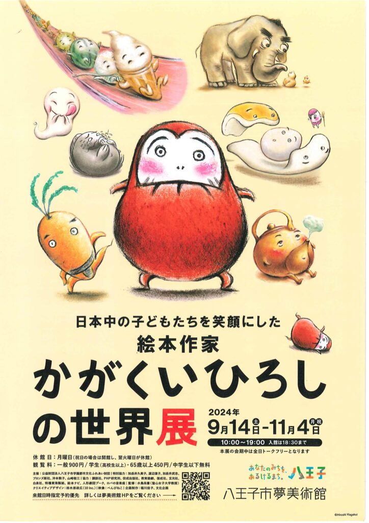 2024/09/13 【かがくいひろしの世界展】 日本中の子どもたちを笑顔にした絵本作家の展示会が八王子にやってきた! ・9月14日(土)~11月4日(月・祝) ・10時~19時(入館は18時半まで) ・八王子市夢美術館(月曜休館、月が祝日の場合は翌火曜が休み) ・一般900円、学生・65歳以上450円、中学生以下無料 https://kagakuihiroshi.com/