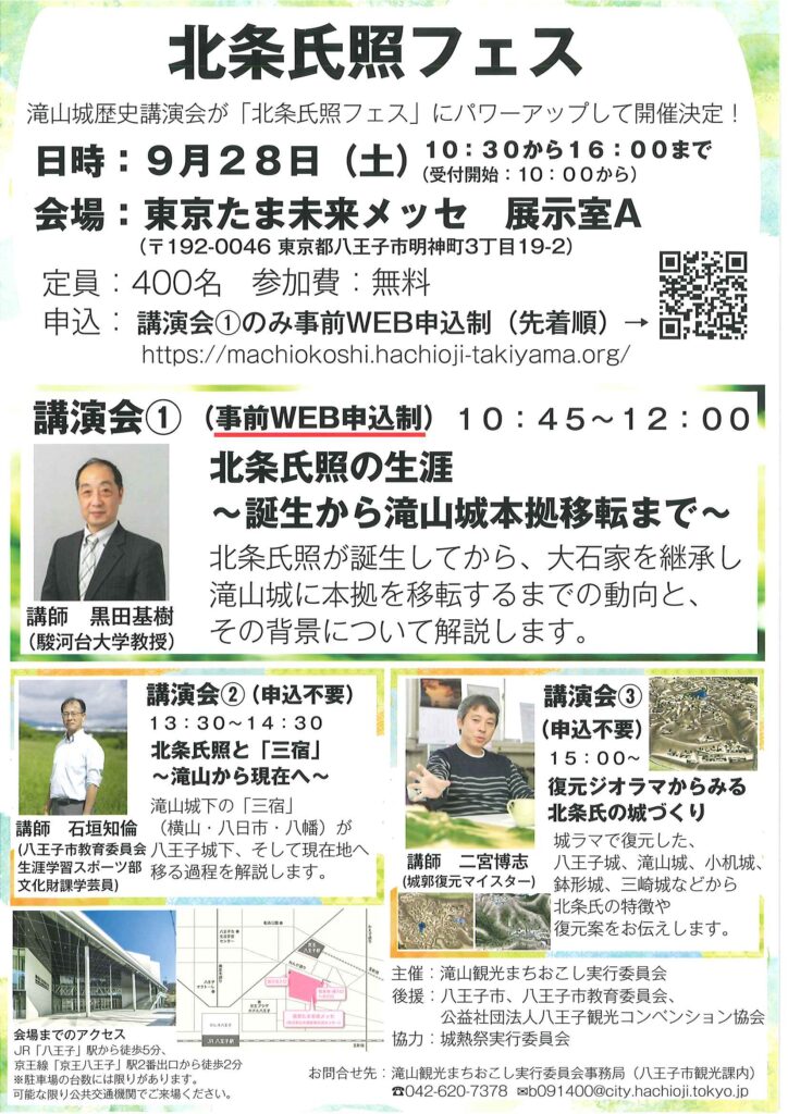 2024/09/17 【北条氏照フェス】 滝山城歴史講演会が「北条氏照フェス」にパワーアップして開催決定! ・9月28日(土)10時半~16時(受付10時~) ・東京たま未来メッセ 展示室A ・定員400名、参加費無料 ※講演会は3つあります。詳しくは以下↓ https://machiokoshi.hachioji-takiyama.org/event/lecture03/