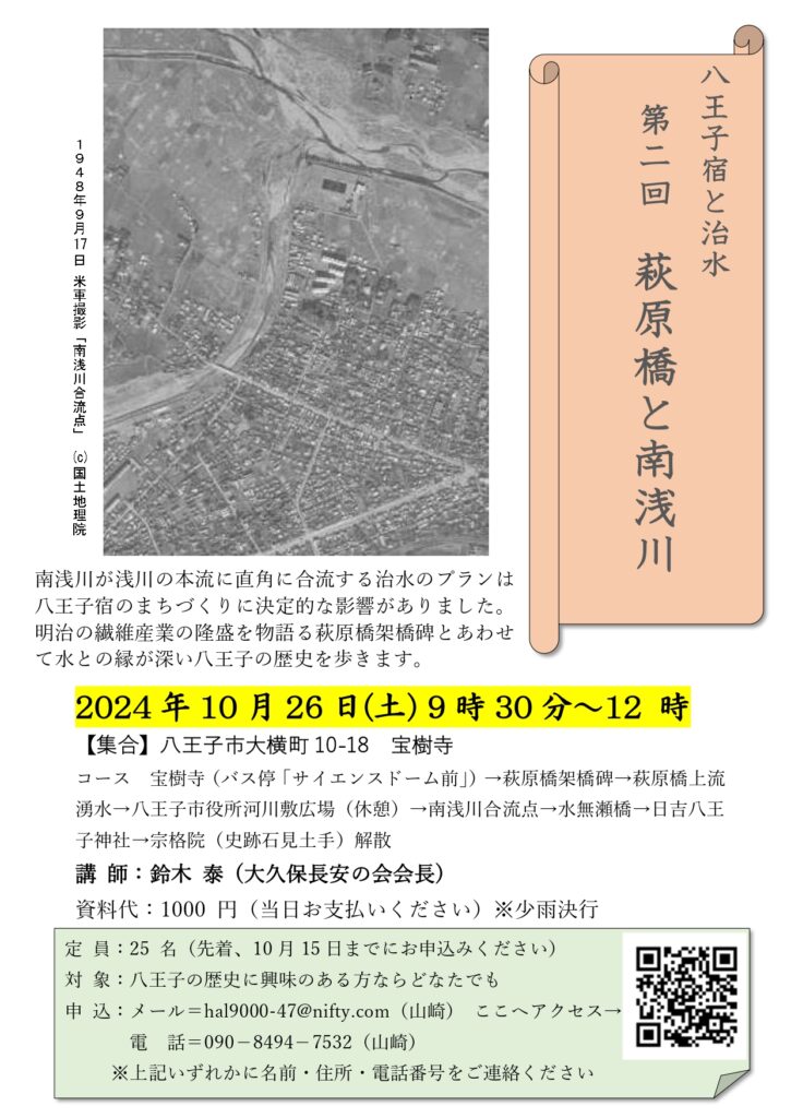 明治の繊維産業の隆盛を物語る萩原橋架橋碑とあわせて水との縁が深い八王子の歴史を歩くイベントです。