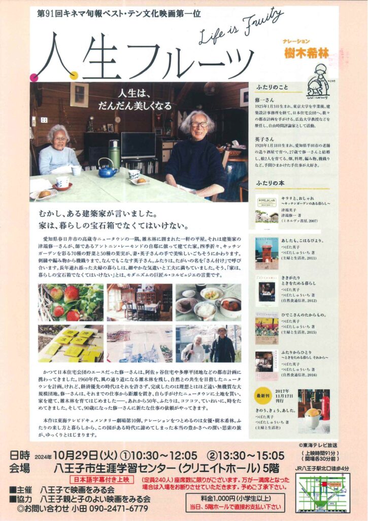 2024/10/09 【映画上映会「人生フルーツ」】 ~人生は、だんだん美しくなる~ 秋が深まってまいりました。 良質のドキュメンタリー映画で思索も深めましょう。 豊かな暮らしってなんだろう? ・10月29日(火)①10:30~12:05 ②13:30~15:05 ・八王子市生涯学習センター(クリエイトホール)5F ・料金1000円(小学生以上、当日支払い) ・各回定員240名(先着順) ・八王子で映画をみる会主催 http://www.tofoo-films.jp/lifeisfruity/?cat=49