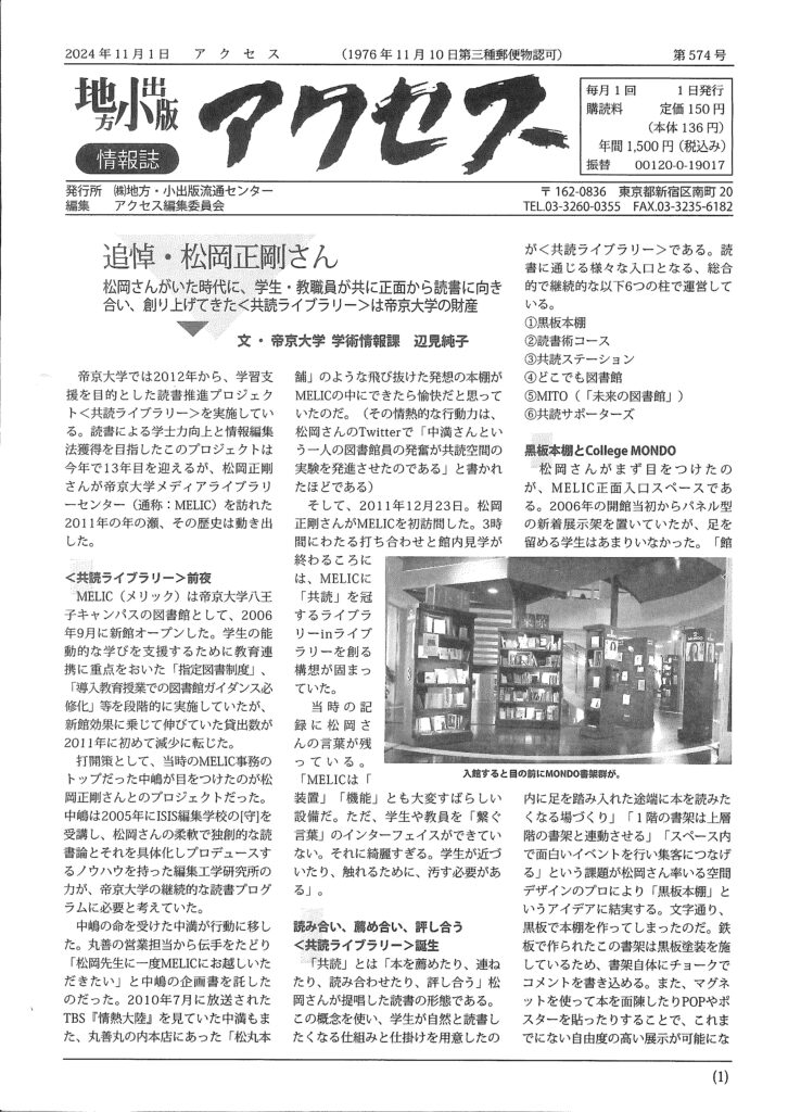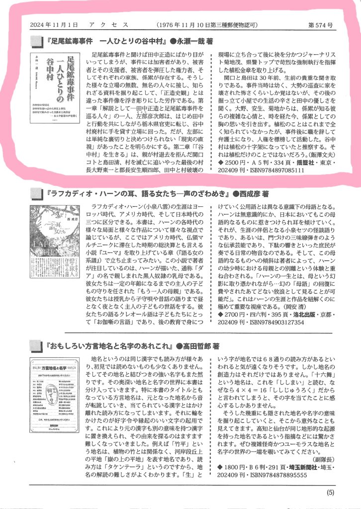取次会社の地方・小出版流通センター発行「地方出版アクセス」にて、永瀬一哉さんの新刊『足尾鉱毒事件 一人ひとりの谷中村』(A5判334P、2500円+税、揺籃社刊)の紹介記事が出ました。