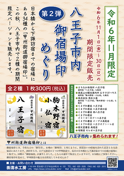2024/11/01 【令和6年11月限定八王子市内御宿場印めぐり」】 昨年春よりスタートした「甲州街道御宿場印」の期間限定版を、市内書店で今日から販売中! この機会にぜひトライしてみてください(11月限定)。 「甲州街道御宿場印」の詳細は当社HPよりどうぞ↓ http://s10148066000003.c32.hpms1.jp/goshukuba