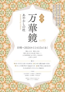 2024/11/06 【朗読 Vol.45「万華鏡 あやかしの杜」】 あなたのそばには あやかしの森 あなたのそばにも あやかしの街 あやかしって なんだ? ・11月15日(金) 13時開場、13時半開演 ・南大沢文化会館交流ホール ・入場料1500円 ・演目「赤いろうそくと人魚」「じゃがいも畑」など ・主催 アンシャンテ