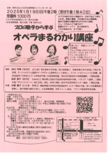 2024/12/20 【プロの歌手から学ぶオペラまるわかり講座】 ・1月19日(日)午後2時~ ・八王子市生涯学習センター南大沢分館視聴覚室 ・定員60人、受講料1000円 ・八王子生涯学習コーディネーター会主催 ※申込 → チラシのQRコードよりアクセス https://cokai8.wixsite.com/website