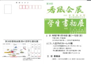2024/12/25 【第38回香風会展・第41回学生書初展】 ・1月10日(金)~12日(日) ・午前10時~午後6時 ※10日は午後1時~、12日は午後3時半まで ・八王子オクトーレ11階 八王子市学園都市センターギャラリーホール ※表彰式 12階イベントホール ・主催 香風会