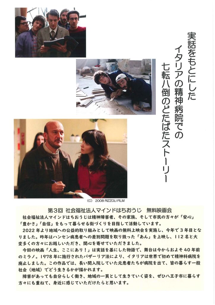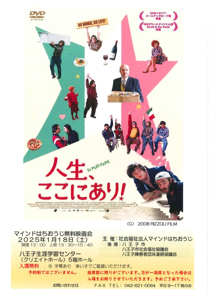 2025/01/16 【上映会「人生、ここにあり」】 実話をもとにしたイタリアの精神病院での七転八倒のどたばたストーリー。字幕あり。 ・1月18日(土) 13時半~15時40分(開場13時) ・八王子市生涯学習センター(クリエイトホール)5階ホール ・入場無料(先着、車椅子可) ・社会福祉法人マインドはちおうじ主催