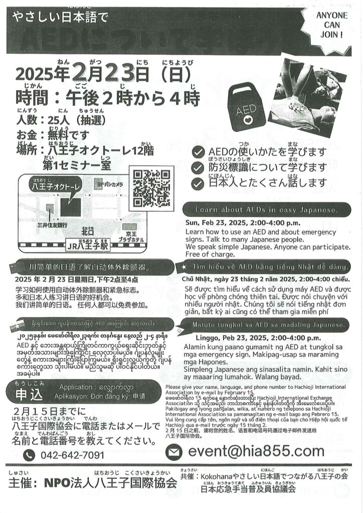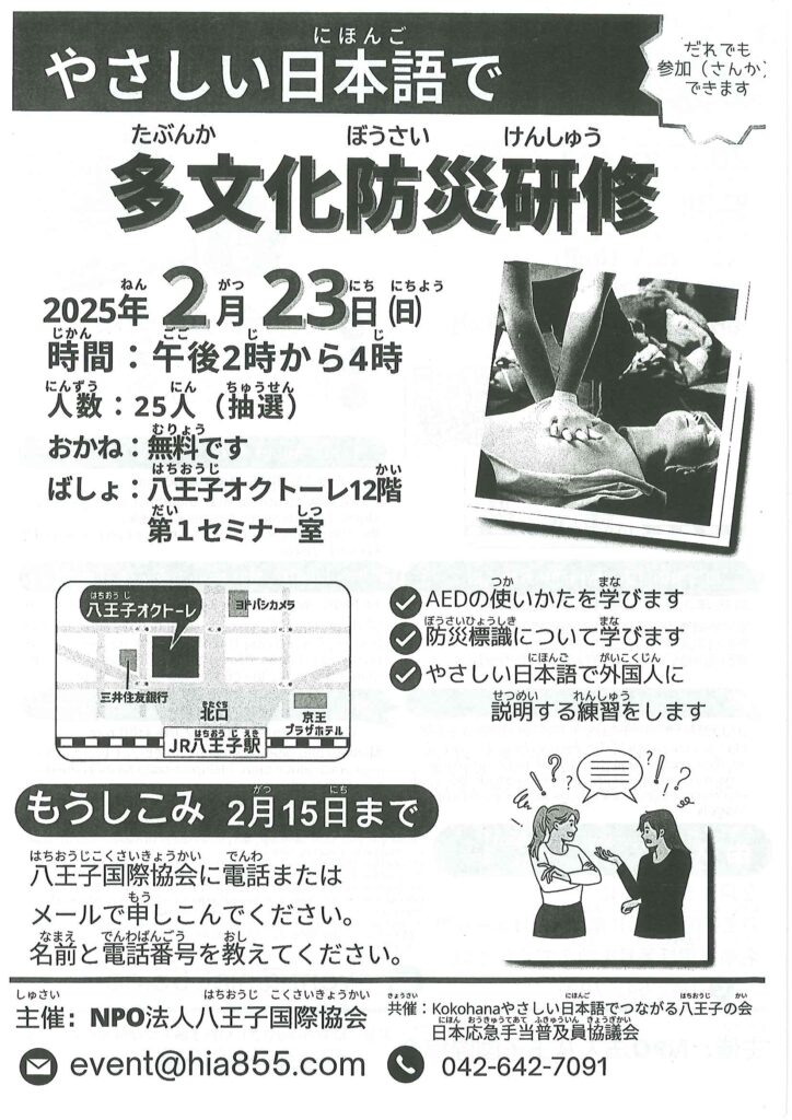 2025/01/31 【やさしい日本語で多文化防災研修】 だれでも参加できます。 AEDの使い方を学びます。 防災標識について学びます。 やさしい日本語で外国人に説明する練習をします。 ・2月23日(日)14時~16時 ・八王子オクトーレ12階 第1セミナー室 ・無料 ・八王子国際協会主催 ※申込 https://hia855.com/other/%e3%82%84%e3%81%95%e3%81%97%e3%81%84%e6%97%a5%e6%9c%ac%e8%aa%9e%e3%81%a7aed%e3%81%ab%e3%81%a4%e3%81%84%e3%81%a6%e5%ad%a6%e3%81%bc%e3%81%86/