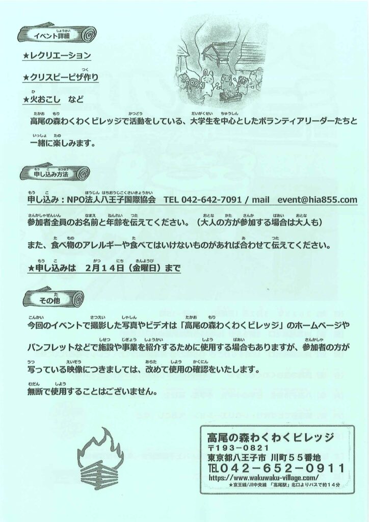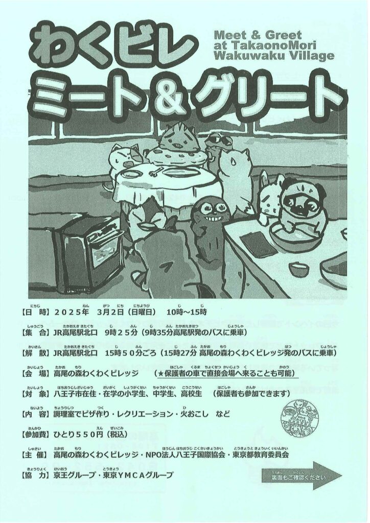 2025/02/10 【わくビレ ミート&グリート】 ・3月2日(日)10時~15時 ・高尾の森わくわくビレッジ ・八王子市在住・在学の小中高生(保護者も参加可能) ・参加費1人550円 ・レクリエーション、クリスピーピザ作り、火おこしなど ・八王子国際協会、高尾の森わくわくビレッジ他主催 https://hachikomi.genki365.net/G0000114/system/event/7493.html