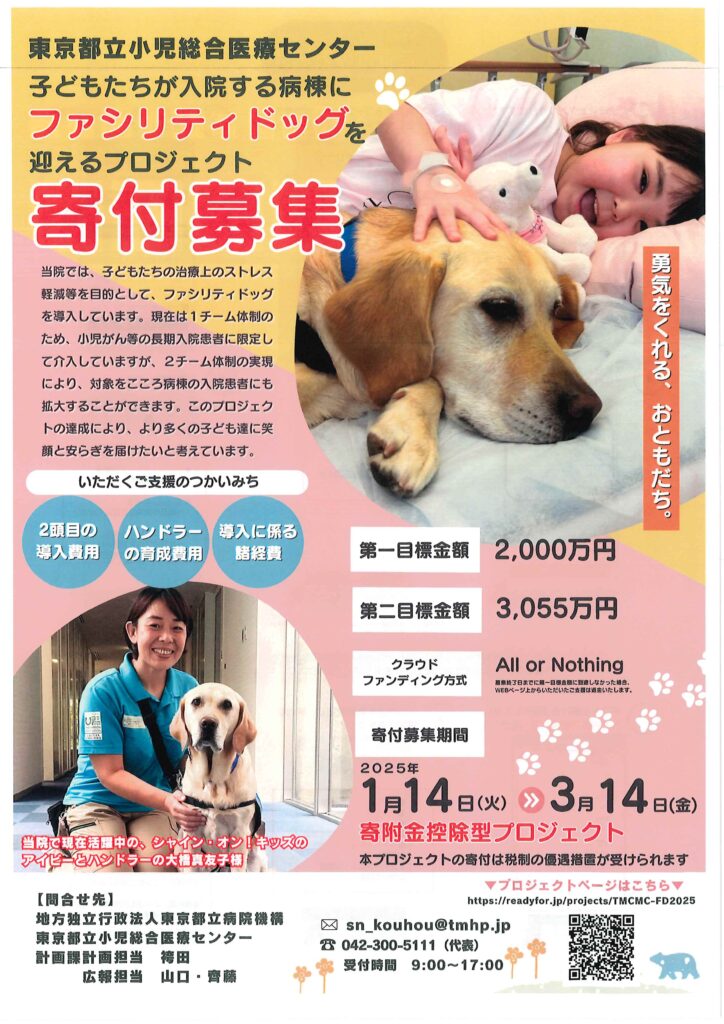 • 【東京都立小児総合医療センター 子どもたちが入院する病棟にファシリティドッグを迎えるプロジェクトの寄付募集】