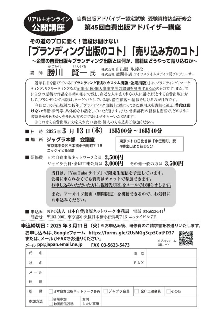 ★【第45回 自費出版アドバイザー講座】