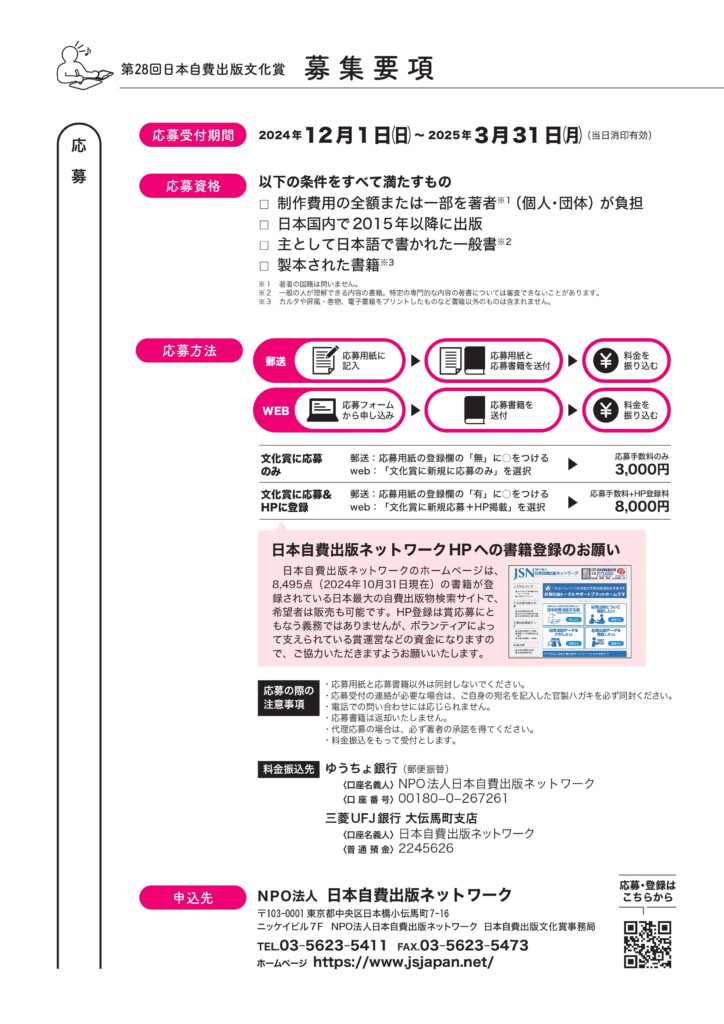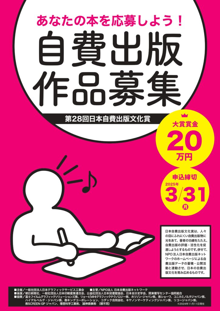 NPO法人日本自費出版ネットワーク主管の「第28回 日本自費出版文化賞」の作品募集が始まりました。