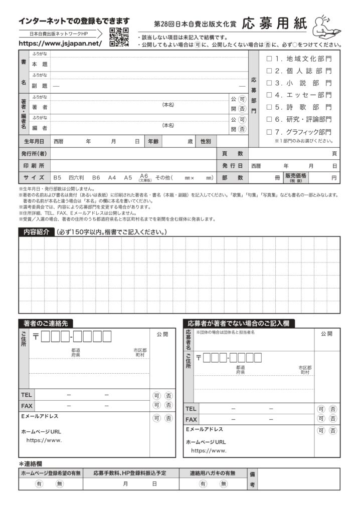 ◎募集部門 1・地域文化部門(郷土史、地域誌、記念誌など)、2・個人誌部門(自分史、遺稿集、旅行記など)、3・小説部門(小説、童話など)、4・エッセー部門(随筆、随想など)、5・詩歌部門(詩、俳句、短歌など)、6・研究・評論部門(研究書、評伝など)、7・グラフィック部門(画集、写真集、絵本など)