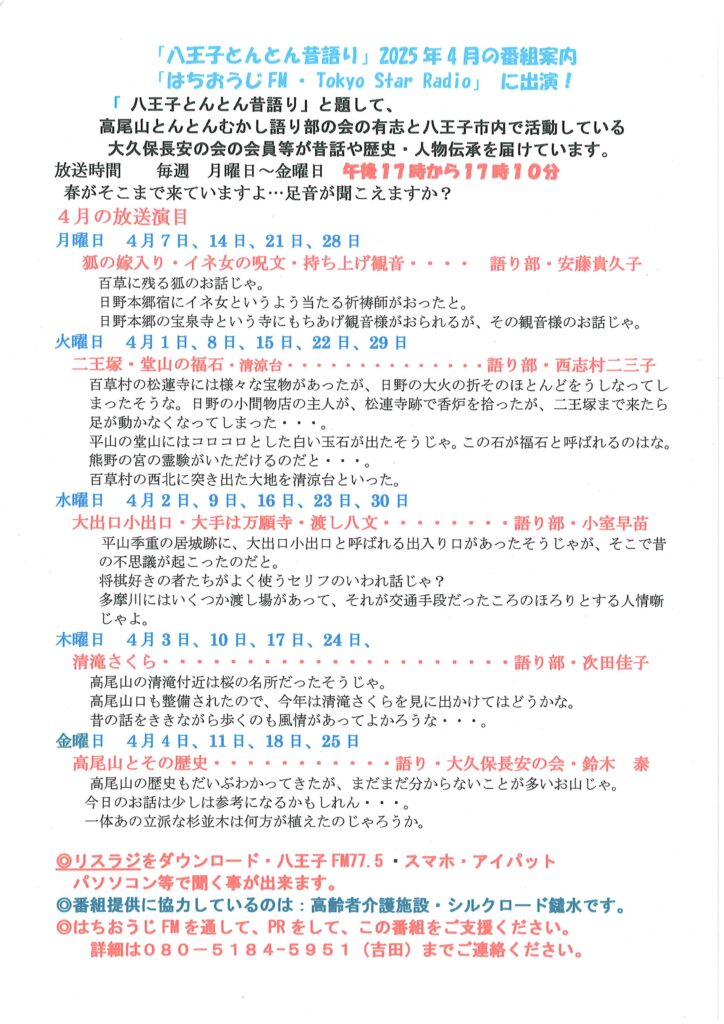 2025/03/31 【八王子とんとん昔語り 2025年4月の番組案内】 ―はちおうじFM Tokyo Star Radioに出演― ラジオ番組「八王子とんとん昔語り」にて、高尾山とんとんむかし語り部の会の有志と八王子市内で活動している大久保長安の会の会員が昔話や歴史・人物伝承を届けています。 ・放送 毎週月~金 17時~17時10分 ※はちおうじFM77.5はリスラジで聴取可能 https://775fm.com/