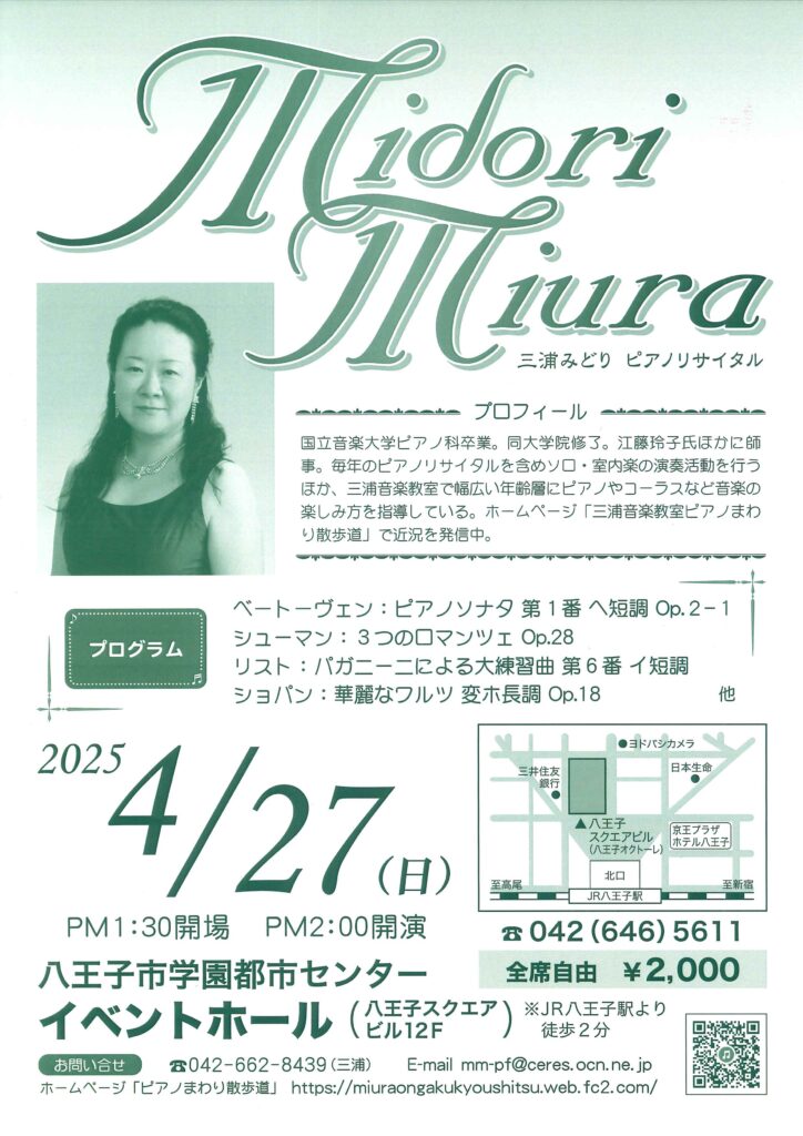 2025/04/14 【三浦みどりピアノリサイタル】 緑風かおる4月のうららかな午後、ピアノの調べに誘われてみませんか。 ・4月27日(日) 13時半開場、14時開演 ・八王子市学園都市センター12F イベントホール ・全席自由 2000円 ・三浦みどりさんの音楽教室のホームページ https://miuraongakukyoushitsu.web.fc2.com/