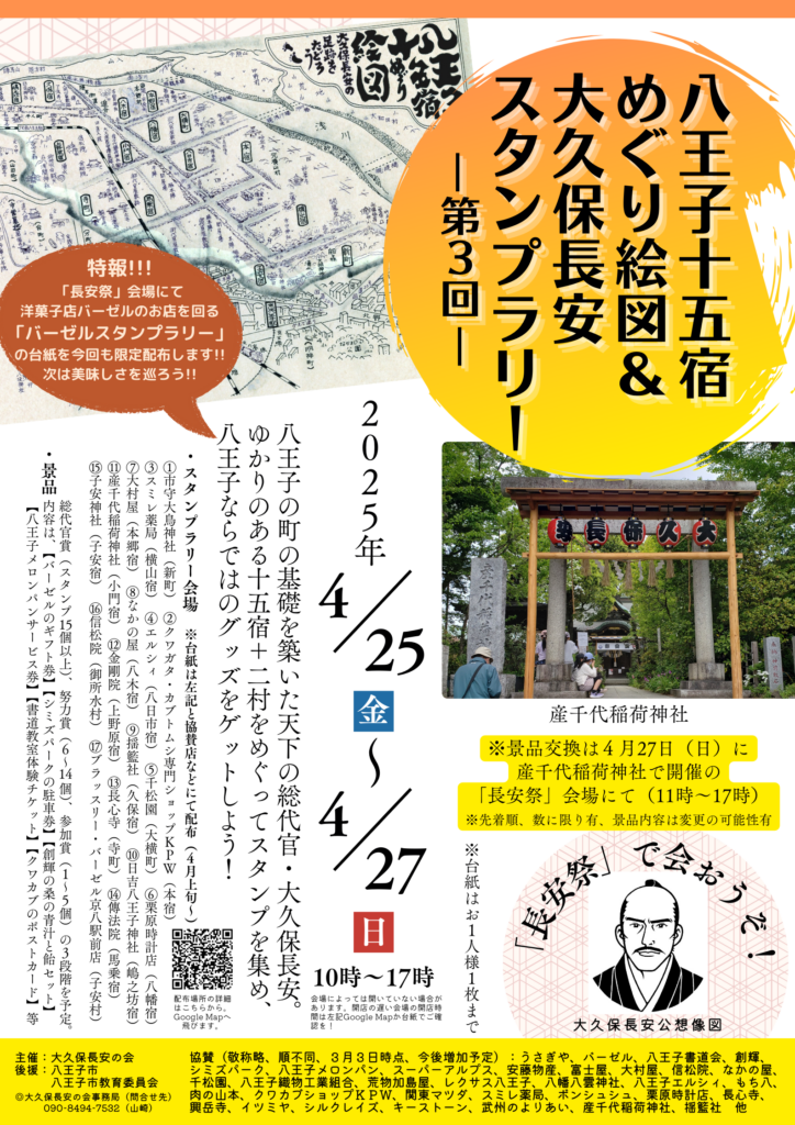 2025/04/25 【大久保長安スタンプラリー1日目】 いよいよ始まりました、#大久保長安 スタンプラリー。 雨はあがり、風もなく、歩くのにはうってつけの1日。 スタンプを集めて、27日の長安祭(#産千代稲荷神社)で豪華賞品をゲットしよう! ※ラリーの台紙の配布場所など詳細は↓ https://www.google.com/maps/d/edit?hl=ja&mid=1_SqBTEym6Wy6WpELs1MNiwJfDW7o6O0&ll=35.65580845398437%2C139.3450546&z=13