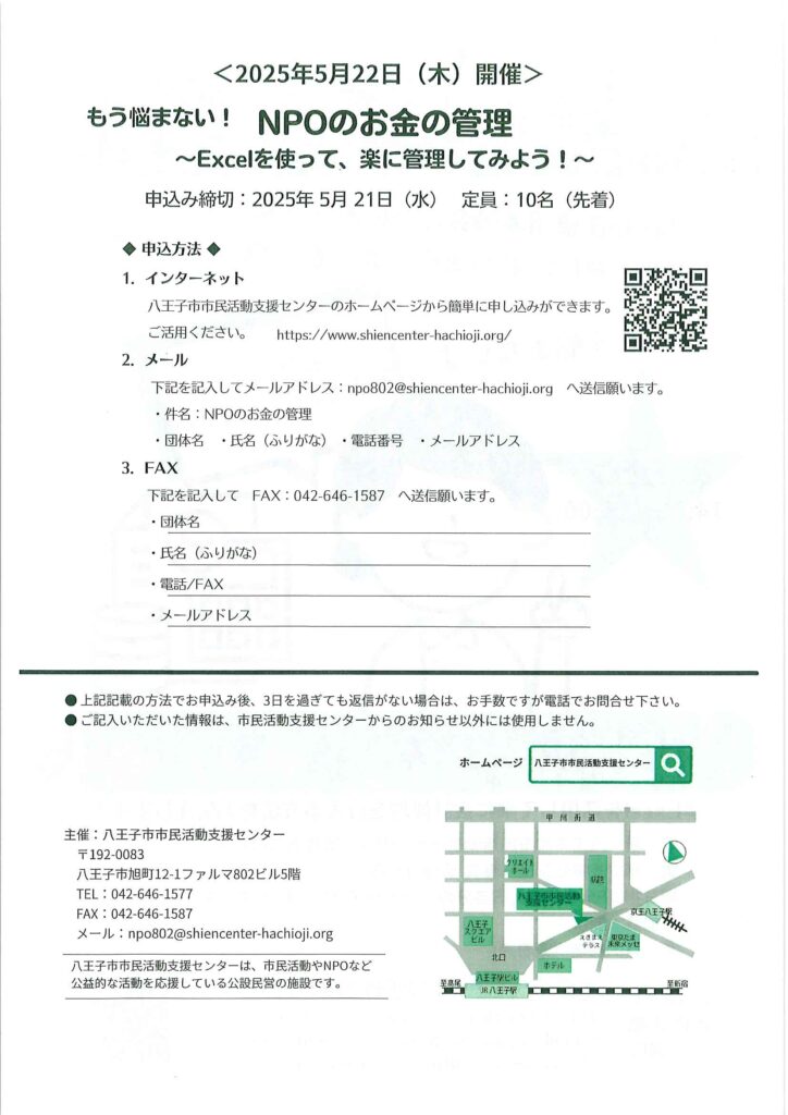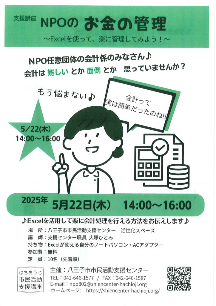 2025/05/20 【支援講座「NPOのお金の管理」】 NPO任意団体の会計係の皆さん! 会計は難しいとか面倒とか思っていませんか? エクセルを使って楽に管理してみよう! ・5月22日(木)14時~16時 ・八王子市市民活動支援センター活性化スペース ・定員10名(参加費無料) ・申込など詳細↓ https://hachikomi.genki365.net/G0000317/event/7844.html