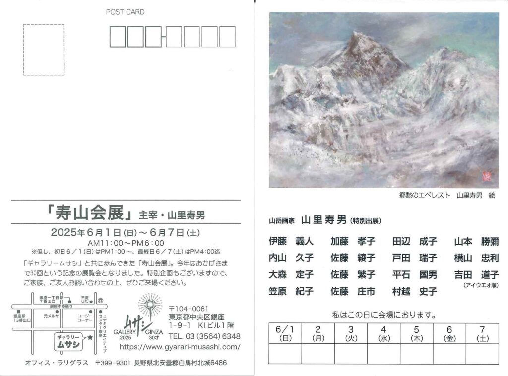 2025/05/22 【寿山会展】 「ギャラリームサシ」と共に歩んできた「寿山会展」。今年はおかげさまで30回という記念の展覧会となりました。特別企画もあります。 ・6月1日(日)~7日(土) ・11時~18時(初日は13時~、最終日は16時まで) ・ギャラリームサシ(中央区銀座1-9-1 K1ビル1階) ・主宰 山里寿男