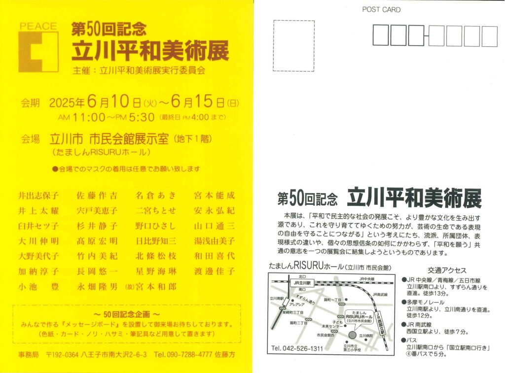2025/06/06 【第50回記念立川平和美術展】 本展は「平和を願う」共通の意志を一つの展覧会に結集しようというものであります。 50回記念企画「メッセージボード」あり。 ・6月10日(火)~15日(日) ・11時~17時半(最終日16時まで) ・立川市市民会館展示室(地下1階) ・立川平和美術展実行委員会主催