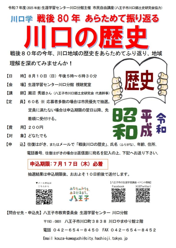2025/07/16 【川口学 戦後80年 あらためて振り返る 川口の歴史】 戦後80年の今年、川口地域の歴史をあらためて振り返り、地域理解を深めてみませんか? ・8月10日(日)17時~18時半 ・生涯学習センター川口分館視聴覚室 ・瀬沼秀雄講師 ・定員60名、200円 https://www.city.hachioji.tokyo.jp/event/007/p035553.html