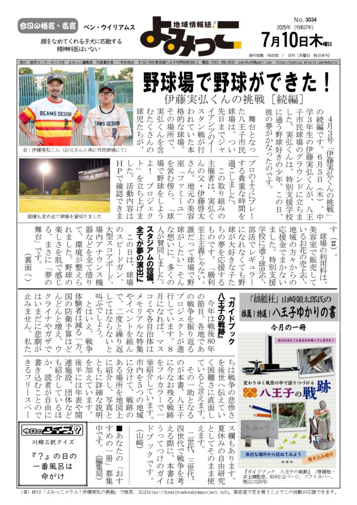 2025/07/17 【『ガイドブック 八王子の戦跡』が紹介されました!】 ローカルメディア「よみっこ」に、当社発行の『八王子の戦跡』が登場。 戦後80年の今年、戦争体験者が減るなか、市内にある戦争の痕跡を教えてくれる貴重な一冊です。 お子さんとの体験学習にぜひご活用ください。 お求めは八王子市内書店にて。