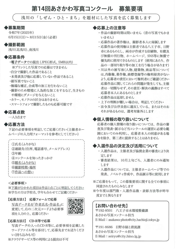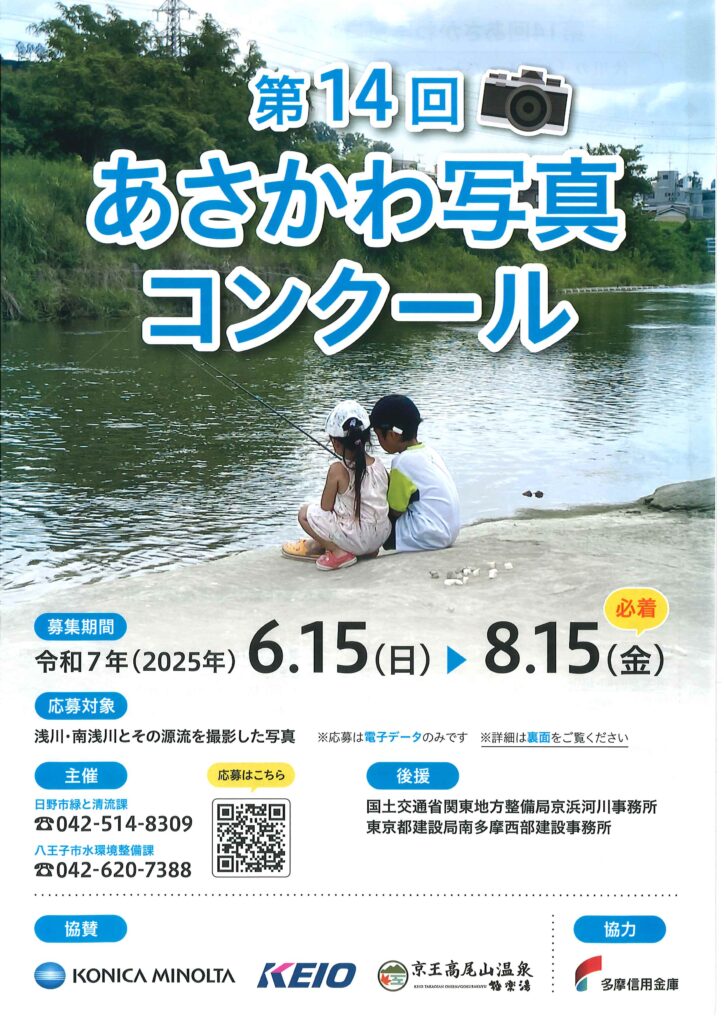 2025/07/28 【第14回あさかわ写真コンクール】 浅川の「しぜん・ひと・まち」を題材にした写真を広く募集します。 ・6月15日(日)~8月15日(金)必着 ・応募対象 浅川・南浅川とその源流を撮影した写真 ・日野市緑と清流課、八王子市水環境整備課共催 ・応募方法など詳細は↓ https://www.city.hachioji.tokyo.jp/kurashi/life/002/004/002/p024112.html