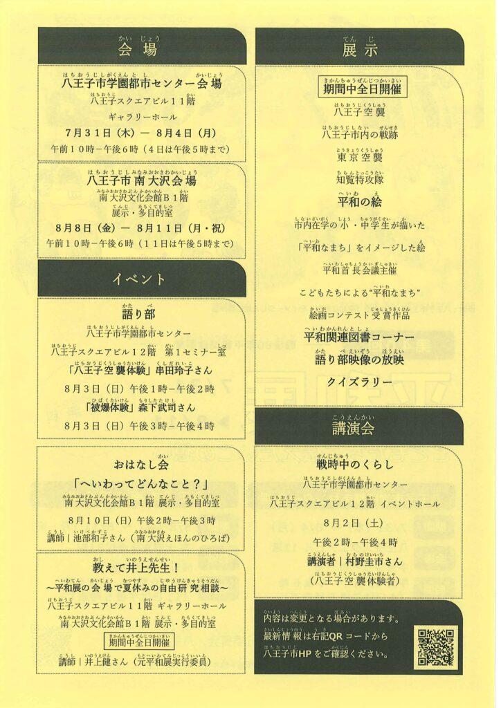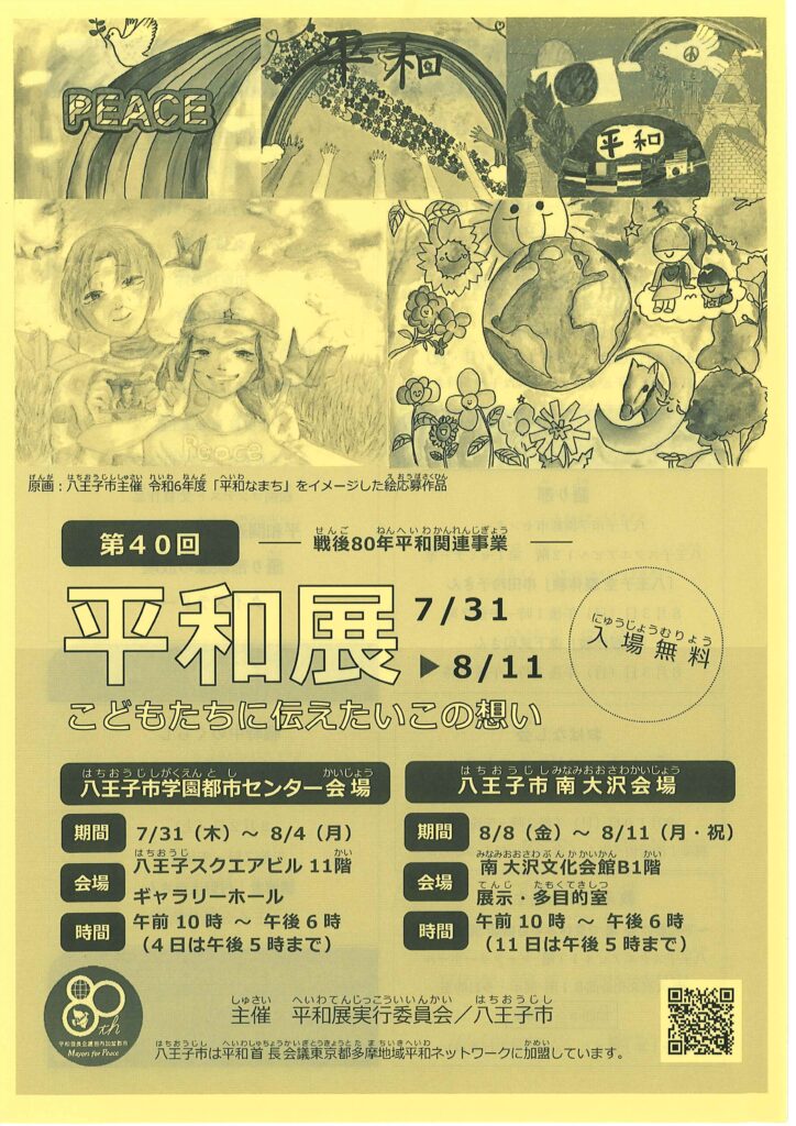 2025/07/29 【第40回平和展―戦後80年平和関連事業―】 こどもたちに伝えたいこの想い――。 ・7月31日(木)~8月4日(月) =八王子市学園都市センター ・8月8日(金)~8月11日(月・祝) =南大沢文化会館会場 ・入場無料 ※展示のほか、語り部、おはなし会、講演会などを予定 https://www.city.hachioji.tokyo.jp/shisei/001/001/018/002/p035775.html
