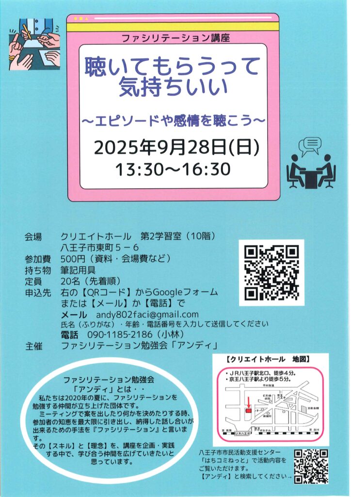 2025/09/19 【聴いてもらうと気持ちいい~エピソードや感情を聴こう~】 ・9月28日(日)13時半~16時半 ・クリエイトホール第2学習室(10階) ・参加費500円、定員20名 ・筆記用具 ・ファシリテーション勉強会「アンディ」 ・申込 https://hachikomi.genki365.net/G0000478/event/8556.html