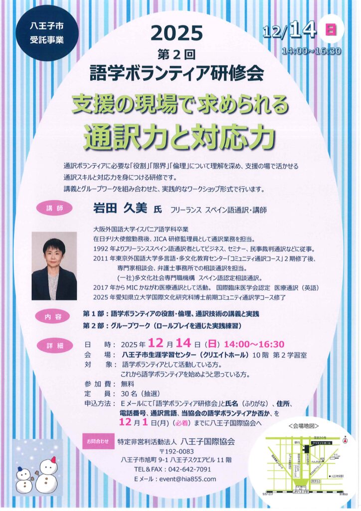 2025/11/13 【2025年第2回語学ボランティア研修会「支援の現場で求められる通訳力と対応力」】 ・岩田久美講師 ・12月24日(日)14時~16時半 ・八王子市生涯学習センター(クリエイトホール)10階 第2学習室 ・NPO八王子国際協会 ・申込は以下よりどうぞ https://hia855.com/other/%E8%AA%9E%E5%AD%A6%E3%83%9C%E3%83%A9%E3%83%B3%E3%83%86%E3%82%A3%E3%82%A2%E7%A0%94%E4%BF%AE%E4%BC%9A-%E7%AC%AC%EF%BC%92%E5%9B%9E-12%E6%9C%8814%E6%97%A5%EF%BC%89/