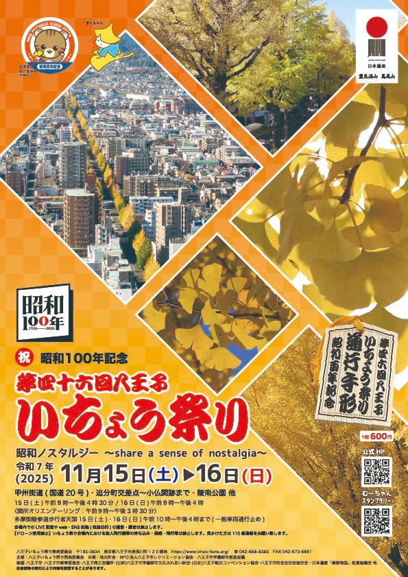 2025/11/14 【第46回八王子いちょう祭り】 「祝 昭和100年記念昭和ノスタルジー ~share a sense of nostalgia~」 ・11月15日(土)、16日(日) 追分関所そばの当社では… ・書籍の特価販売 ・雑紙やメモ帳の100円均 ・子ども向け輪投げ ・「甲州街道御宿場印」期間限定版 https://www.ichou-festa.org/